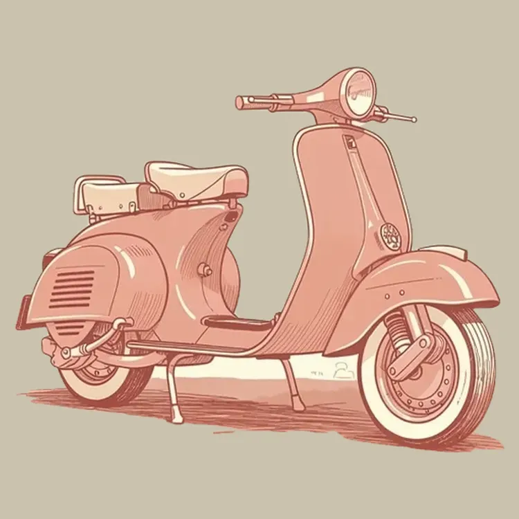 Loose 1970s travel‑poster scooter in faded coral on washed terracotta. Minimal Mediterranean linework, cream ink for a sun‑bleached vintage feel.