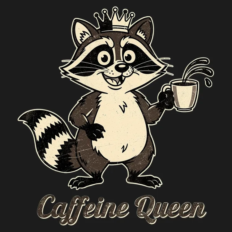 Hand-drawn vintage raccoon crowned as the Coffee King, spilling a tiny cup — playful, slightly worn distressed look.