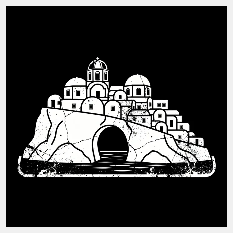 Minimal badge with Santorini white-washed houses and sea arch silhouette. One-color faded screen-print with light distressing.