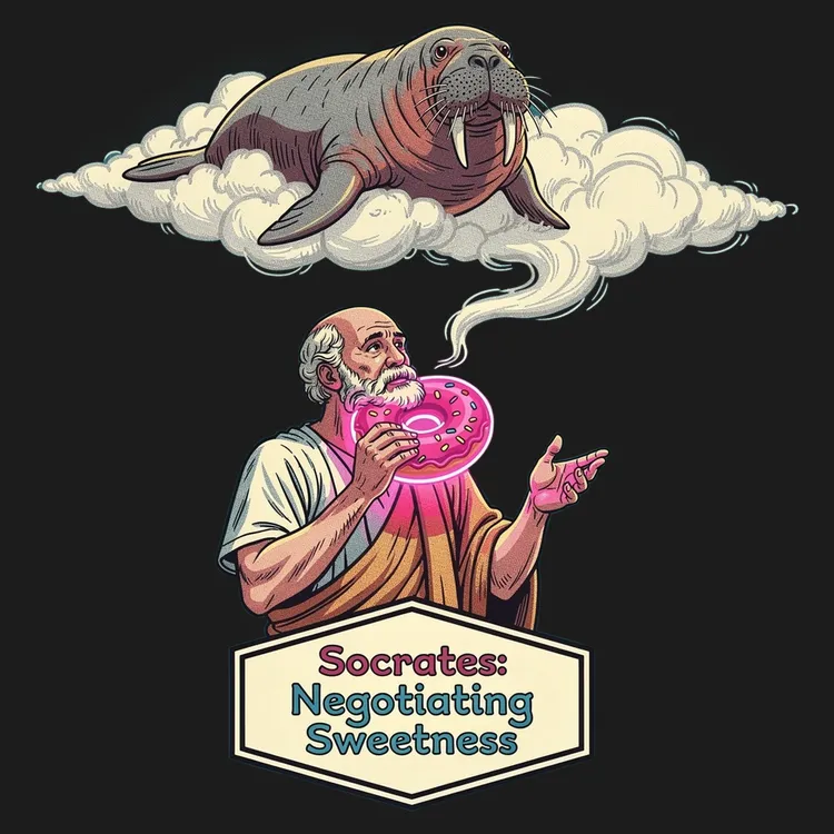 Socrates eats a neon donut while arguing with a walrus-shaped cloud. Campy, surreal badge with bold halftone textures and light distressing.