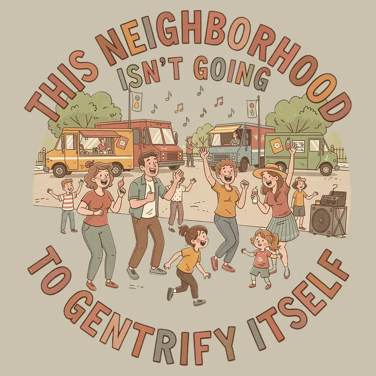 Celebrate community spirit with this vibrant design featuring joyful people and food trucks. Stand out while supporting local culture!