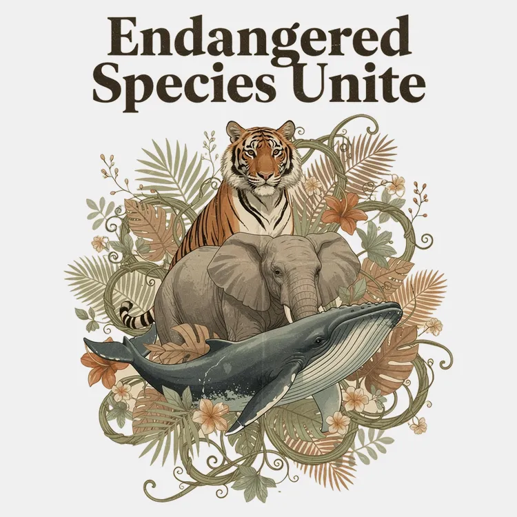 Celebrate wildlife with this vibrant tee featuring a tiger, elephant, and whale surrounded by lush foliage.
