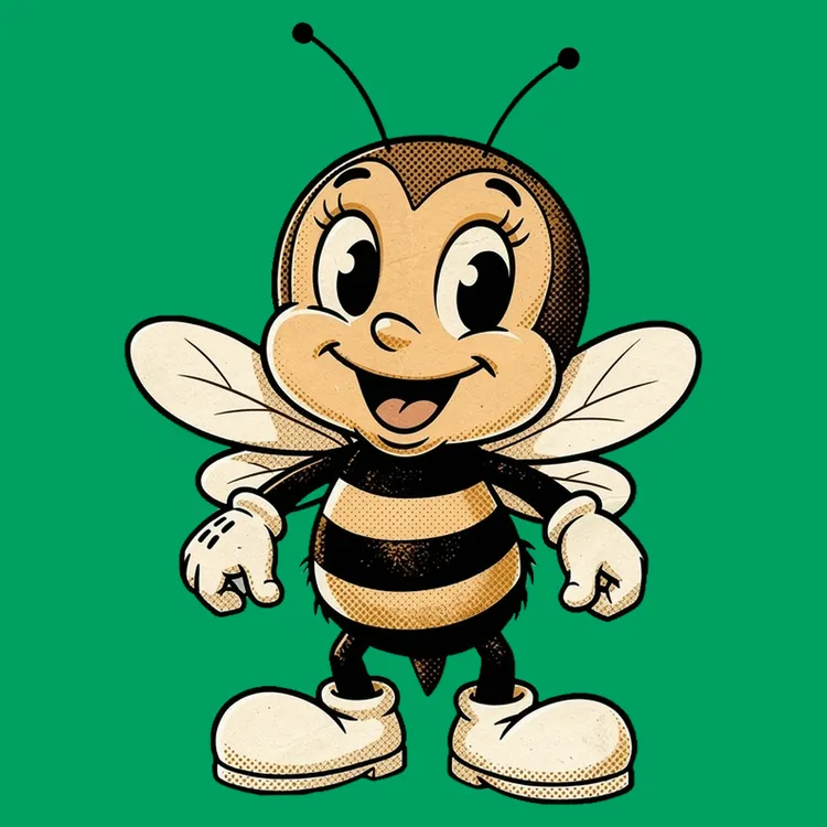 Golden‑age cartoon bee mascot with daisies in warm amber on faded sage—playful and nostalgic.