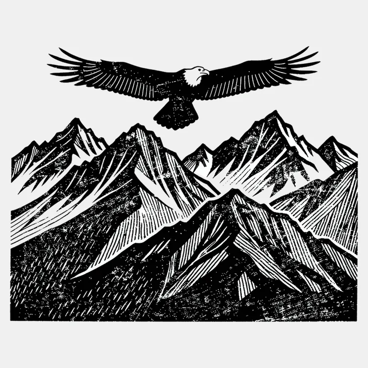 Woodcut-style badge of Patagonia mountains with condor silhouette. High-contrast black woodblock look, light distressing.